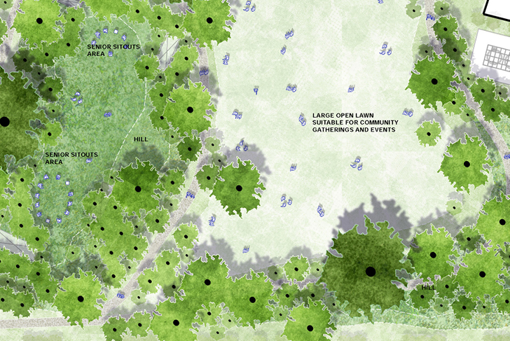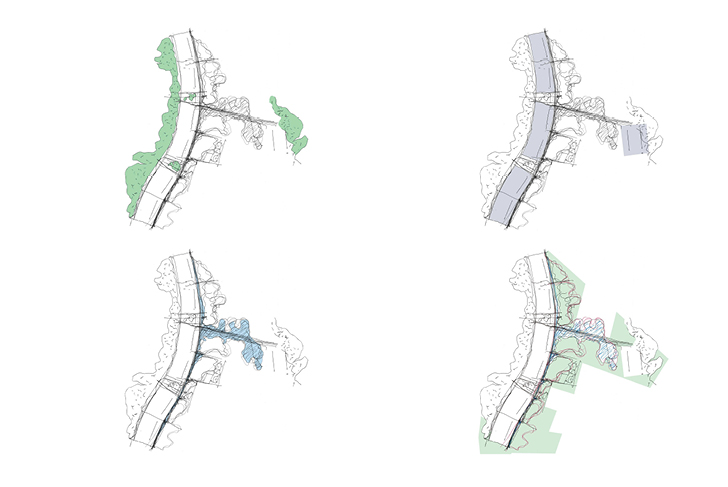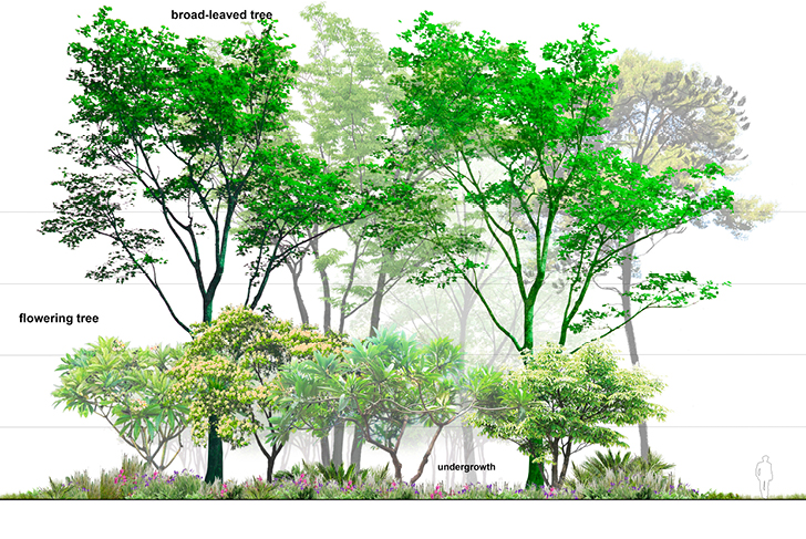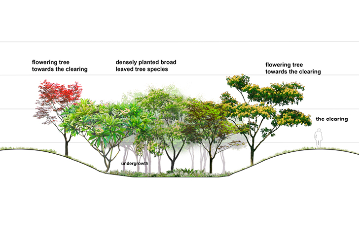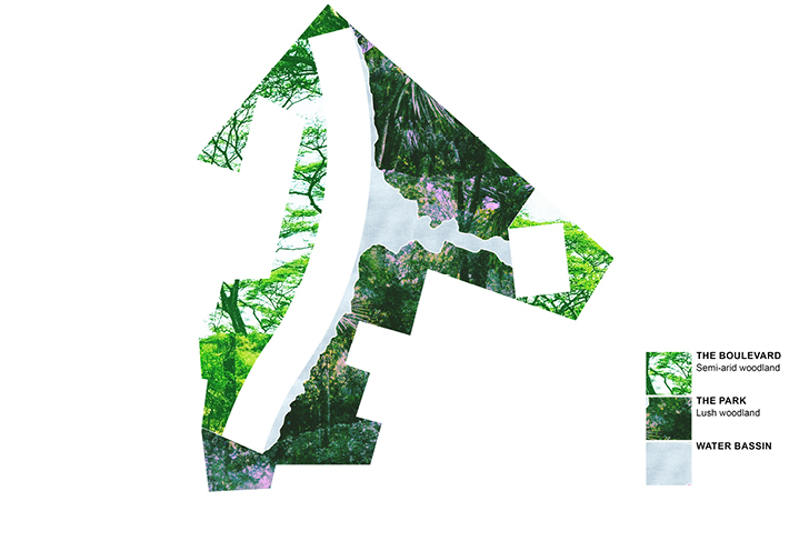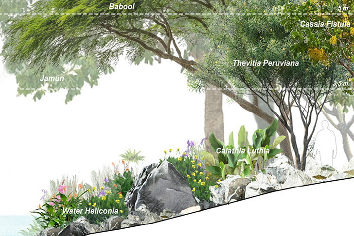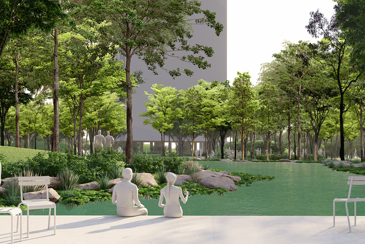 Ce quartier de Gurogram, l’une des principales ville satellite de Dehli, se transforme en oasis, associant eau et végétation. Ce nouveau paysage se définit selon trois grandes entités. Le boulevard, densément planté, se transforme en parkway. Acacias (acaciamodesta et Nilotica) et Flamboyant du désert (butea monosperma), le bordent, diffusant ombrage et fraîcheur. Ces espèces typiques de la forêt locale semi-aride, adaptées à la sécheresse, renforcent le lien avec le contexte existant. Chaque tour est identifiée par une espèce d'arbre spécifique. Dans les halls d'entrée, un bassin aquatique aux plantes sculpturales et élancées est visible depuis l'intérieur ou l'extérieur du bâtiment. La terrasse, socle minéral à la géométrie linéaire légèrement incurvée, suit la disposition des tours. Entièrement recouverte de grès, elle crée une continuité entre les espaces intérieurs et extérieurs du rez-de-chaussée. La terrasse longe le bassin d’eau qui s’étend sur l'ensemble du site. Le bassin adresse aux bâtiments un bord linéaire et géométrique et, en contrepoint, un tracé naturelle et organique s'ouvre sur le parc. Ses collines encadrent les vues et améliorent la perception de l'espace. Des sentiers informels y serpentent, bordés d’arbres et d’arbustes. Des clairières ouvertes définissent ponctuellement des espaces pour différentes activités. Sa végétation luxuriante et richement stratifiée (grands arbres, arbustes et couvre-sols) offre un intérêt tout au long de l'année, créant un paysage mouvant.
