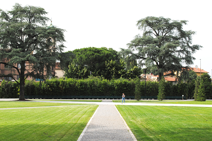 The town of Nova Milanese is nestled in the Po Valley, just north of Milan. The valley’s patchwork agricultural landscapes have been sculpted by drainage and irrigation systems: dikes, hedgerows, and canals. Piazza Gioia, the town’s central square, is an indistinct space comprised of a parking lot surrounding a lawn. Majestic, hundred-year-old cedars—botanical giants in need of preservation and reverence—are the only remarkable features of the lawn.