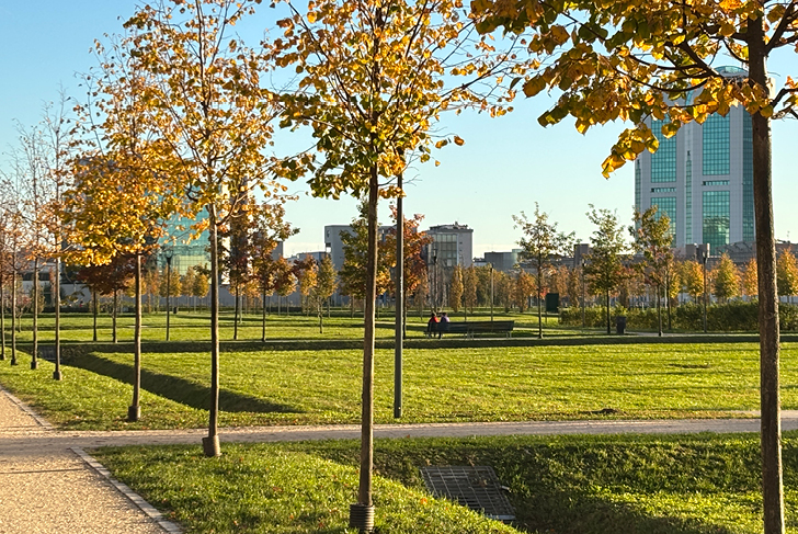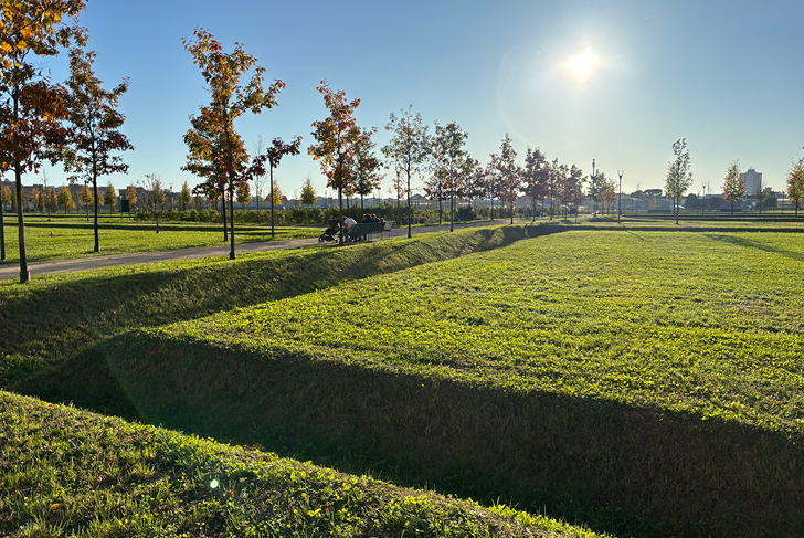 Le paysage de la plaine du Pô se reconnait à sa trame agraire parfaite et ses composants, peu nombreux, se répètant indéfiniment: digues, canaux, haies de peupliers encadrant les carrés de cultures. Une combinatoire presque organique qui introduit d'infinies et surprenantes variations. Au fil du temps, les villages et les constructions se sont enracinés et développés dans cet assemblage. La périphérie de Milan garde les traces de cette singulière rencontre entre la ville et cette trame agraire. Le parc Calchi Taeggi et le quartier qui le borde, miniaturisent cette situation historique. Ce paysage intermédiaire est familier dès sa création. Si les usages urbains y sont nouveaux, les composants sont tous connus : lignes d’horizons, plantations, chemins évoquent l'univers de la plaine du Pô. Le nouveau quartier s'insère dans le tissu urbain. Les chemins se tissent avec le bâti, les vergers et les peupleraies organisent les transparences et cadrent les vues. Depuis les bâtiments le regard glisse au-dessus des arbres fruitiers vers la campagne miniature.