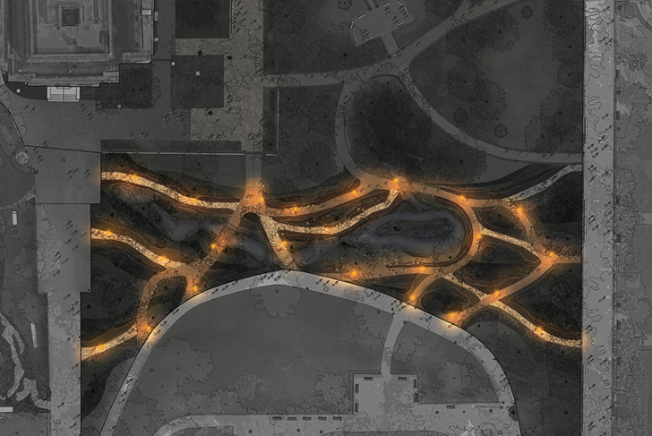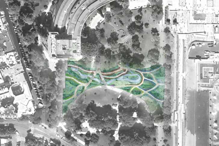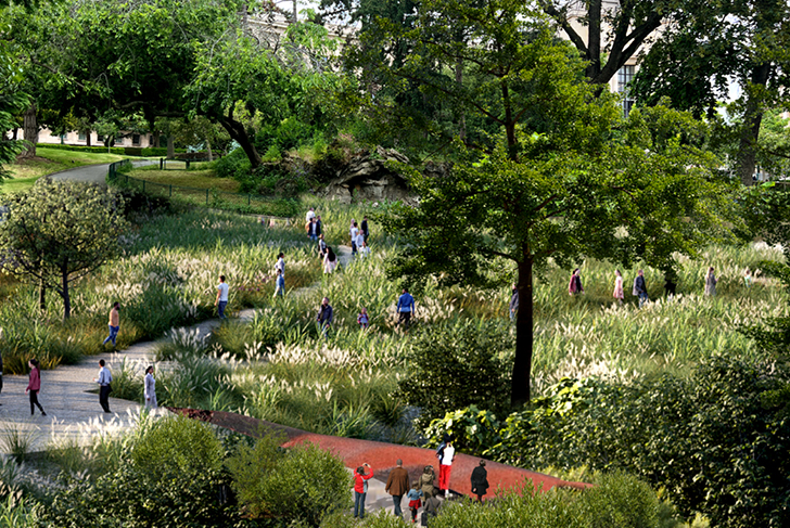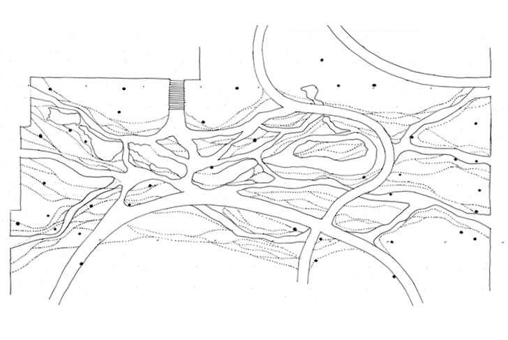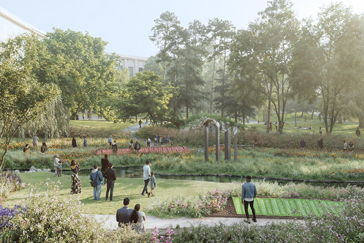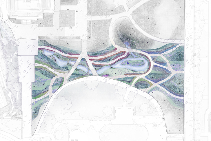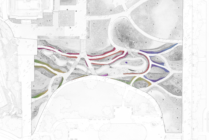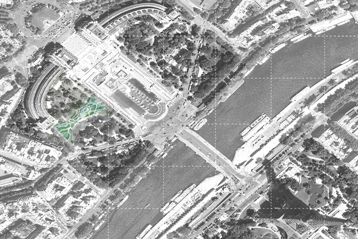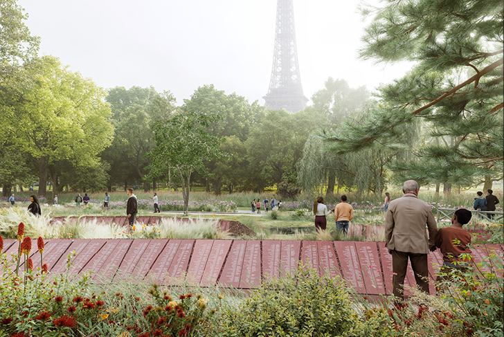 S’inscrivant dans les jardins historiques du Trocadéro, ce jardin mémoriel vient ajouter une nouvelle couche de sens à l’histoire du lieu, tout en respectant l’existant. Doté d’une forte dimension paysagère et spirituelle, il répond au besoin de dédier un lieu de commémoration à la communauté des descendants de victimes de l’esclavage, et à la société dans son ensemble. La Rivière Suisse devient naturellement le cœur du projet. L’eau y jaillit symboliquement sous la forme d’une source d’espoir et de vie, évocatrice du rapport au lointain, aux océans et à la mer. Un jardin intime et foisonnant se déploie à partir de ce cours d’eau requalifié, dont le dessin tout en courbe fait écho aux lits et boucles d’un cours d’eau en liberté. Cette nature enveloppante provoque chez le promeneur une sensation de légèreté et d’apaisement, le rendant disponible à la découverte de ce lieu et au recueillement. Chacune des îles fluviales, à travers ses odeurs, ses couleurs et ses textures propose aux visiteurs une expérience végétale singulière et évocatrice qui convoque les paysages d’Outre-Mer. Méandres et îles fluviales créent un paysage résolument contemporain, extrêmement lisible, résilient et évocateur.
