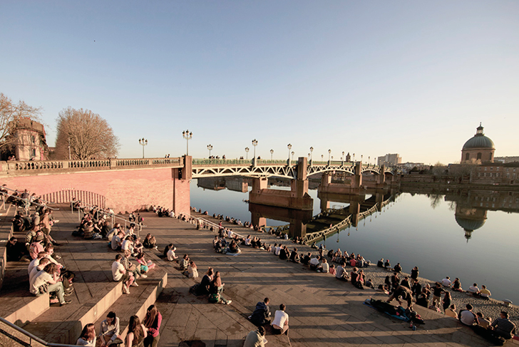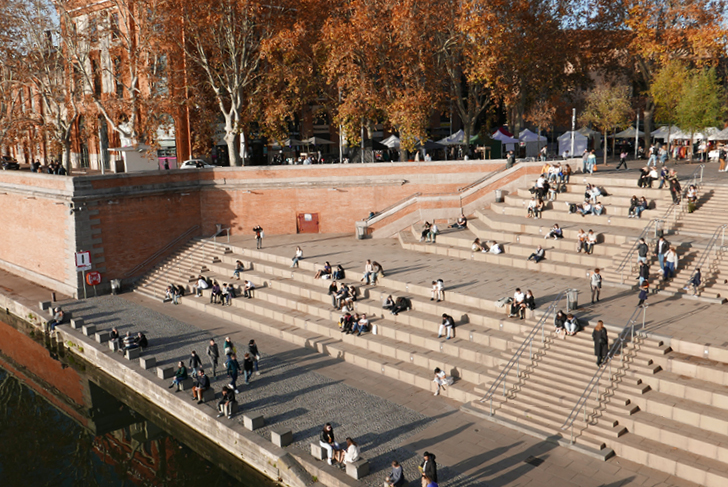 La place Saint-Pierre retrouve son statut de place centrale s'ouvrant sur la Garonne. Côté centre-ville, dans la partie haute, l’espace récupéré sur les places de stationnement est dédié aux piétons et permet l’installation de terrasses sous les arbres nouvellement plantés. Un pavage uniforme en pierre de porphyre unifie la place de façade à façade. De nouveaux arbres sont plantés en bosquets, contrastant avec l'alignement des grands platanes historiques. Côté Garonne, un amphithéâtre, conçu avec des marches confortables en grès des Pyrénées, offre un nouvel accès direct aux berges du fleuve. Ce nouveau lieu de rencontre est également attractif la nuit grâce au nouvel éclairage mettant en valeur le fleuve en arrière-plan.
