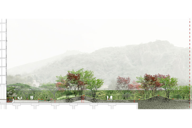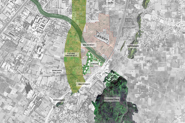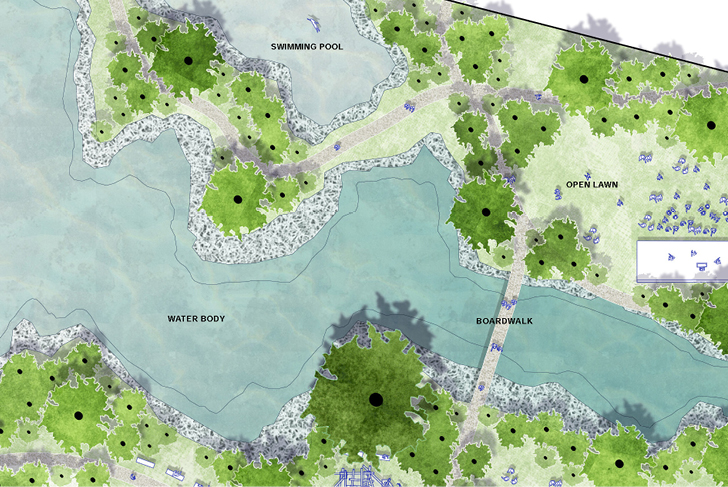 Ce quartier de Gurogram, l’une des principales ville satellite de Dehli, se transforme en oasis, associant eau et végétation. Ce nouveau paysage se définit selon trois grandes entités. Le boulevard, densément planté, se transforme en parkway. Acacias (acaciamodesta et Nilotica) et Flamboyant du désert (butea monosperma), le bordent, diffusant ombrage et fraîcheur. Ces espèces typiques de la forêt locale semi-aride, adaptées à la sécheresse, renforcent le lien avec le contexte existant. Chaque tour est identifiée par une espèce d'arbre spécifique. Dans les halls d'entrée, un bassin aquatique aux plantes sculpturales et élancées est visible depuis l'intérieur ou l'extérieur du bâtiment. La terrasse, socle minéral à la géométrie linéaire légèrement incurvée, suit la disposition des tours. Entièrement recouverte de grès, elle crée une continuité entre les espaces intérieurs et extérieurs du rez-de-chaussée. La terrasse longe le bassin d’eau qui s’étend sur l'ensemble du site. Le bassin adresse aux bâtiments un bord linéaire et géométrique et, en contrepoint, un tracé naturelle et organique s'ouvre sur le parc. Ses collines encadrent les vues et améliorent la perception de l'espace. Des sentiers informels y serpentent, bordés d’arbres et d’arbustes. Des clairières ouvertes définissent ponctuellement des espaces pour différentes activités. Sa végétation luxuriante et richement stratifiée (grands arbres, arbustes et couvre-sols) offre un intérêt tout au long de l'année, créant un paysage mouvant.