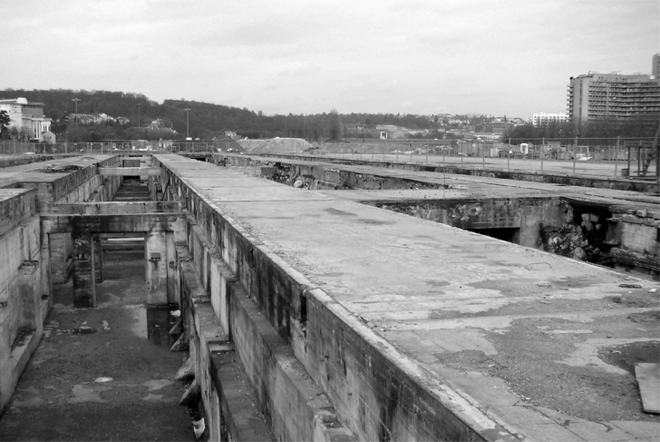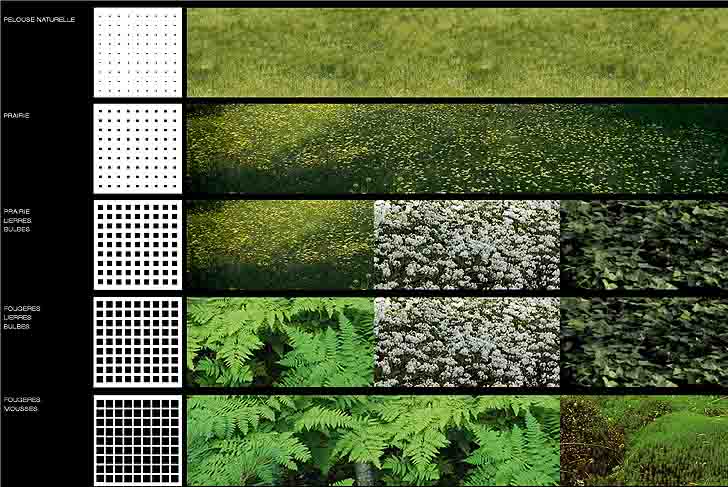 Nous avons décrypté, superposé et croisé les nombreux relevés des fondations de l’île pour transposer la matière même du socle. L’image d’un paysage possible, qui résulte de ce processus graphique d’observation, se traduit en une mosaïque de surfaces minérales et plantées, et en une strate d’arbres. L’implantation pointilliste de ces derniers reprend et soulige les différentes densités des structures souterraines.