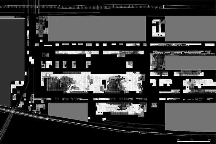 Le statut des futurs espaces publics est intermédiaire, entre place et jardin. L’agencement de très grandes dalles de béton dessine les jardins creux. Ces dalles incluent les voies et les surfaces fonctionnelles ; elles permettent des usages intensifs et l’implantation flexible de nombreux programmes.
