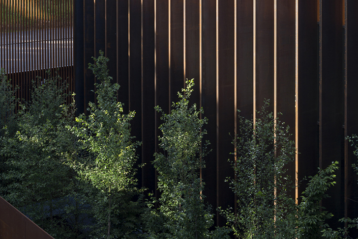 A l’intérieur du bâtiment, deux patios offrent un puit de lumière de 8 mètres de profondeur. La salle polyvalente, la salle de théâtre et le foyer des musiciens gravitent autour des deux espaces plantés de grands arbres : chênes, charmes, bouleaux. Cette plantation forestière dense offre les ambiances d’un boisement - finesse des silhouettes, graphisme des troncs, reflets du feuillage et couleurs automnales.