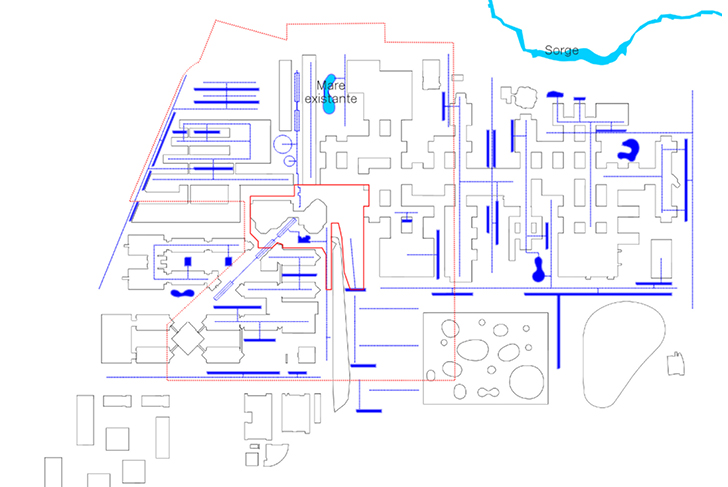 Tout un ensemble de noues, fossés, mares et dépressions humides favorisant l’infiltration et le stockage des eaux pluviales est recréé. Ce nouveau «quartier éponge» tend vers un rejet nul au réseau. Mises en réseau, ces zones humides assurent des continuités aquatiques avec le cours d’eau de la Sorge. Les sols sont rendus perméables.