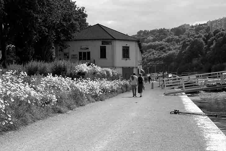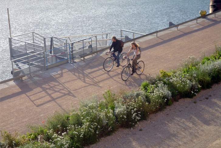 Depuis plus de 15 ans, nous avons été associés à plusieurs études pour la requalification de Lyon Confluence, un territoire de 150 hectares, s’étendant au sud de la gare de Perrache, entre Rhône et Saône. La promenade de Saône en constitue une étape initiale et provisoire. Dès 1999, il a été décidé de substituer au parc unitaire initialement projeté par la ville, un « système de parcs » composé d’un cordon longeant la Saône et de ramifications innervant l’intérieure du territoire. Le programme de transformation rapide, transitoire et surtout économique du site industriel détermine le choix d’un système de plantations très léger et la mise en œuvre de cette promenade prototype de 2,5 km. Reposant directement sur le sol existant laissé en l’état, des « plaques-jardins » contenues dans une structure grillagée sans rive apparente composeront un tapis végétal de 9000 m² sur le quai. Cette occupation temporaire et valorisante donne une qualité immédiate aux quais et rend cette partie jusqu’alors inaccessible de la ville à un large public lyonnais : vélos, familles avec poussettes. L’enjeu est ici de donner un statut à un territoire, de l’entretenir, et d’en accepter la transformation. Les opérations sont de l’ordre de la gestion, de la maintenance, et du respect de l’existant, quand bien même tout ne relève que d’une qualité et d’un usage provisoires.