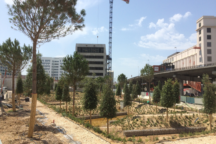 Le paysage industriel côtier de la Joliette laisse place à un quartier d’affaire à l’image des ambitions économiques et culturelles de la métropole. Le jardin se situe entre le nouveau théâtre de la Joliette et l’ancienne minoterie, à la bascule entre nouveau quartier et docks dédiés aux circulations. L’aménagement y est fortement contraint par le passage en souterrain de l’A5. Le rythme des plantations est dicté par des lignes et des perspectives qui prolongent la structure des entrepôts et du quai. Le cœur du site étant dans une dépression, le jardin se fait point de recueillement des eaux des terrains avoisinants. Des bassins de faible profondeur se succèdent, répondant à un impératif technique majeur, le drainage des sols du quartier et l’absorption des grandes pluies décennales. Ils confèrent au site une qualité esthétique grâce à leurs formes empruntées aux bâtiments qui s’y reflètent.