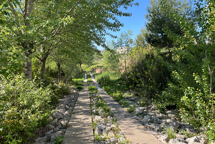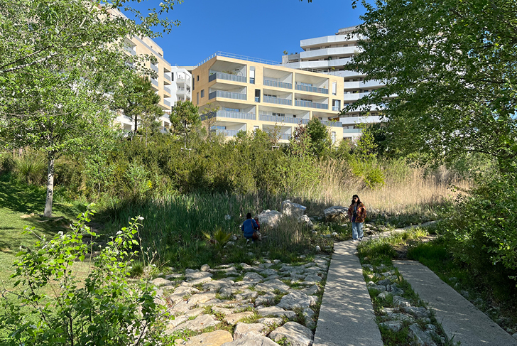 Le quartier naissant de la ZAC Nouveau Saint Roch se déploie sur les friches d’une ancienne gare de marchandises, à proximité directe de la gare de Montpellier. Le long des voies ferrées, un talus inversé et des ensembles de bureaux constituent une barrière efficace aux nuisances sonores générées par les trains. Ils permettent l’édification d’une couronne de logements ouverts sur le Parc René Dumont. Au cœur de l’opération, ce dernier offre une pelouse de 6000 m2 ponctuée de masses arborées à l’échelle des hauts bâtiments du quartier. Ces plantations aux lisières épaisses donnent aux visiteurs l’illusion d’un paysage forestier plus vaste ; elles découpent la pelouse en trois clairières généreuses - une pelouse irriguée, une plaine sèche et une prairie humide - qui multiplient les points de vue sur la ville. Dans la continuité du square Planchon et du Parc Clémenceau, le Parc René Dumont offre une nouvelle respiration urbaine, un corridor nord-sud perméable essentiel à l’articulation du quartier avec le tissu urbain existant.