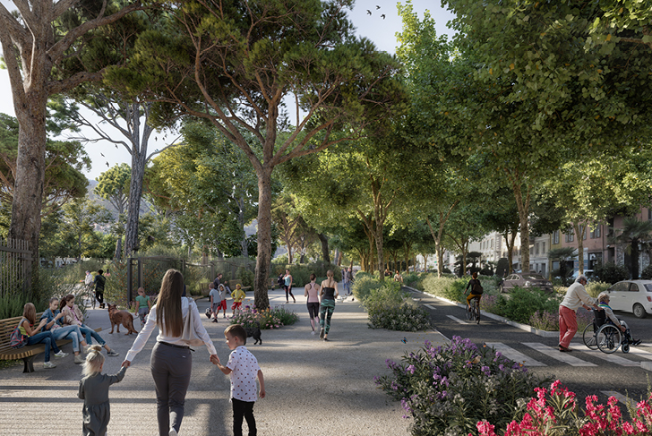Ce grand parc urbain de 10 hectares se déploie sur la deuxième séquence de la promenade du Paillon qui recouvre le fleuve éponyme. Sa première séquence, qui part de la mer, présente un vocabulaire jardiné aux vastes pelouses ouvertes sur la ville. Dans une complémentarité esthétique et programmatique, le nouveau parc, aux plantations denses et continues, orchestre la transition vers l’arrière pays. Dans un travail de transposition très précis, la vallée sèche du Paillon qui se découvre en amont est transposée. La rivière et son lit de galets, la ripisylve et les versants boisés sont transformés en un objet paysager sur dalle à l’artifice assumé. La palette végétale est composée d’espèces indigènes de la Riviera et des Alpes Maritimes. La vallée sèche est figurée par un lit de galets et d’enrochements en pierre calcaire claire qui alterne avec des surfaces végétalisées. De part et d’autre se succèdent la pelouse et la prairie fleurie (vastes espaces ouverts libres d’appropriation) et le boisement (véritable écosystème forestier). La clairière centrale offre une percée visuelle sur les montagnes à l’arrière plan et crée un jeu avec le grand paysage. Les différences d’altimétrie créent une multiplicité de points de vue et de situations. Les tracés sinueux des principaux cheminements et du système de fil d’eau et de bassins reflètent la rivière qui sillonne en dessous. Le dessin de ce nouveau ruban ‘naturel’ est imprégné de la géomorphologie de la vallée du Paillon. Cette miniature d’écosystème méditerranéen s’étend dans la ville par la plantation des voies alentour.