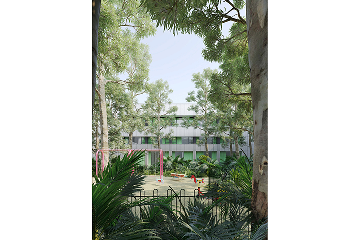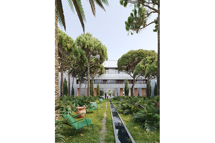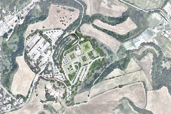 Les jardins se situent dans la périphérie nord de Rome, entre la réserve naturelle de l'Insugherata et le parc de l'Inviolatella Borghese. Le projet paysager repose sur l'amplification de la géographie existante à l'extérieur des bâtiments, topographie de talus couverts de bosquets, . Les 4 cours sont transformées en jardins thématiques, chacun caractérisé par une essence d’arbres (palmiers, eucalyptus, pins et figuiers) accompagnée d’une riche couche arbustive diversifiée. De denses bosquets amplifient la trame arborée du site, cadrant ponctuellement les vues ou mettant en valeur les accès. Les sols des parkings sont rendus poreux et la strate arborée y est densifiée et enrichie d’une strate arbustive diversifiée. Des prairies thermophiles résistantes aux températures élevées s’installent sur les terrasses des bâtiments.
