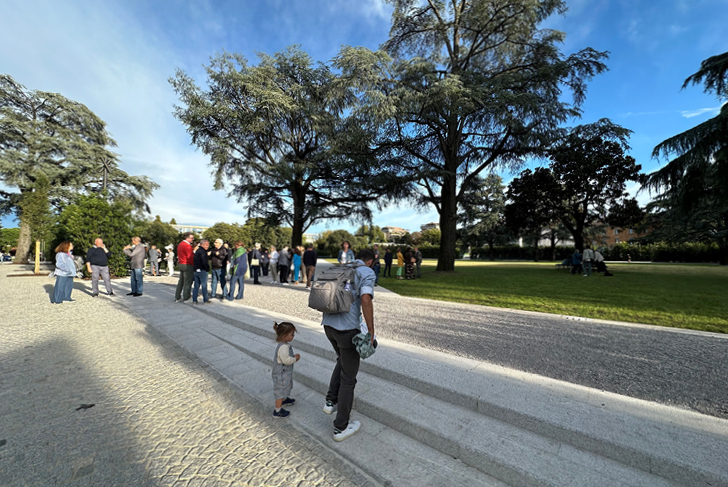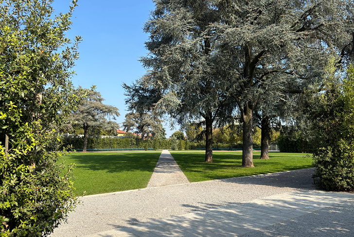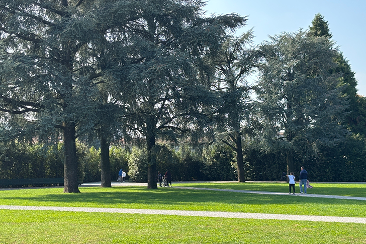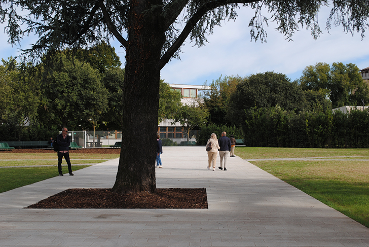 La commune de Nova Milanese, au nord de Milan, s’inscrit dans le paysage agricole en damier de la vallée de Pô, façonné par ses techniques de drainage et d’irrigation (digues, haies, canaux). Dans le tissu urbain de Nova Milanese, un bâti dense, minéral coexiste avec une riche trame végétale constituée par les jardins et parcs historiques. La place Gioia, à quelques mètres au nord du canal Villoresi, se situe dans le périmètre de cette trame verte à laquelle nous souhaitons pleinement l’intégrer. Sa transformation en une vaste place-jardin, libérée du trafic et fortement végétalisée, offre aux habitants un espace public essentiel et lisible. Les cèdres, majestueux et centenaires, sont magnifiés par le dessin d’une vaste pelouse. De jeunes cèdres sont plantés afin d’anticiper la disparition des sujets les plus âgés. La pelouse est structurée par des allées en diagonale, très graphiques, pavées en pierre naturelle. Elles offrent des circulations fluides entre la ville et l’école ou la mairie. La ‘terrasse’, allée la plus large, permet des usages multiples. Un chemin minéral en calcaire, cerne la pelouse. De longs bancs y sont disposés ainsi qu’un éclairage n’empiétant pas sur les haies de laurier qui le bordent. Celles-ci permettent de séparer ce nouveau lieu de vie de la voirie, physiquement et visuellement. Les rues Giussani et Bondi, aux abords de la nouvelle place-jardin Gioia, font la part belle aux piétons.