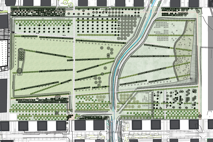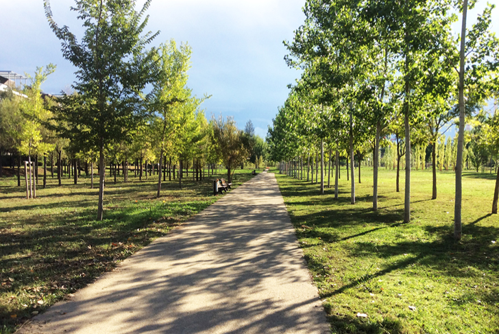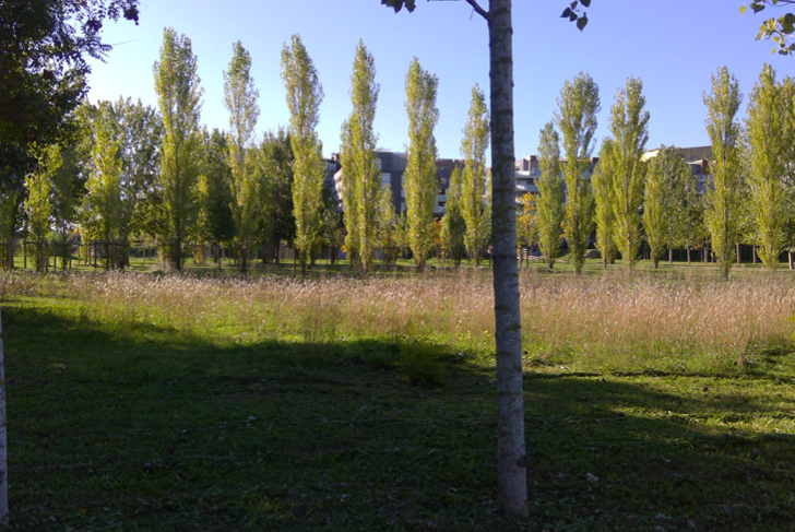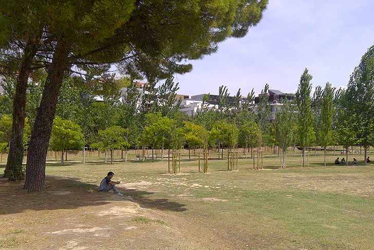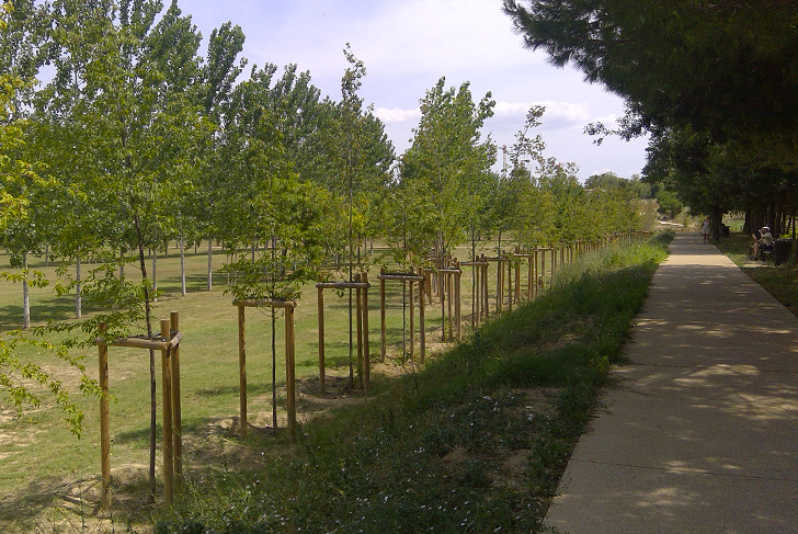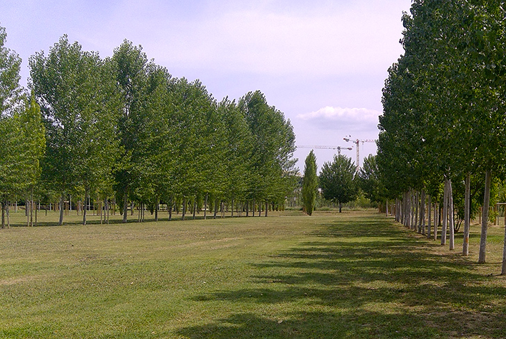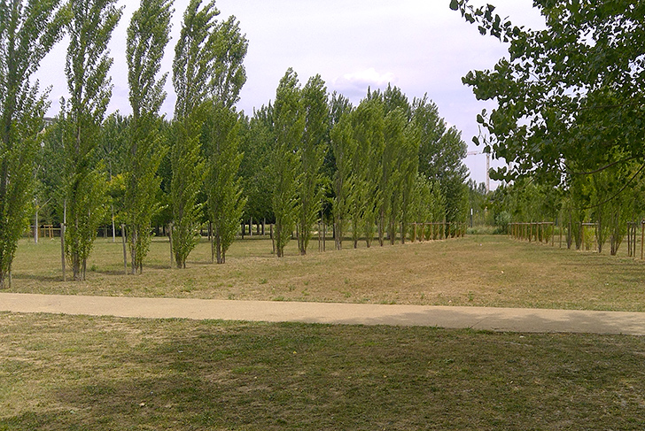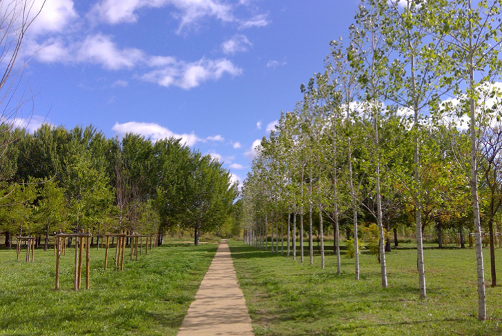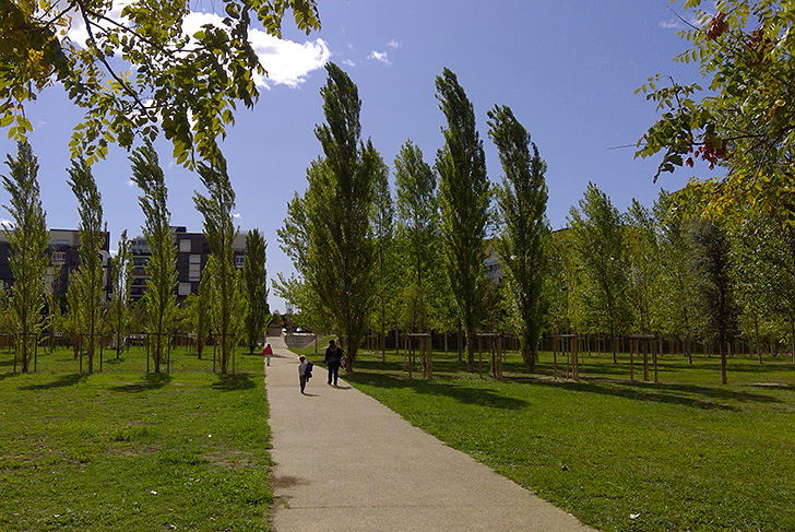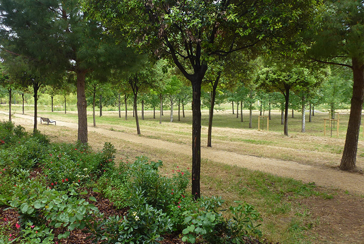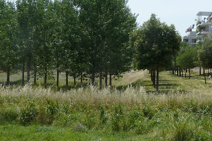 Le Parc Charpark constitue l’un des éléments fondateurs du schéma directeur paysager du quartier Port Marianne. Son aménagement a permis la réalisation rapide d’un bassin de retenue d’eau contrôlant les crues des deux rivières qui traversent le secteur, tout en amorçant la transformation progressive du territoire. Le bassin encaissé est entouré de talus arborés dont la structure végétale évolue depuis plus de dix ans. Organisées selon une trame régulière à densité variable, les différentes espèces sont réparties par blocs, offrant dès leur plantation des sortes de « pièces », des aires de jeux et de repos. Ces prés et boisements sont gérés selon des techniques forestières et agricoles. Ils évoquent dans leur état intermédiaire un paysage de campagne. Une fois les arbres parvenus à maturité, la strate arborée évoluera en larges bosquets aléatoires constitutifs des nouveaux quartiers.