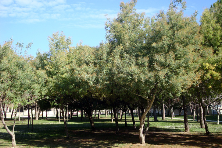La trame d’arbres suit l’orientation est-ouest établi auparavant lors du plan directeur de Port-Marianne. Le système de plantation du jardin peut être défini comme une miniaturisation des principes employés par les forestiers. Le long de ces lignes, les distances entre les arbres sont aléatoires ou varient en fonction des essences. L’effet produit est celui de boisements « naturels » épais, excepté depuis l’axe des logements où les alignements perceptibles redonnent aux sujets plantés leur dimension urbaine.