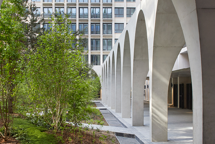 La transformation de l’ancienne cité administrative est pensée en étroite collaboration avec l’architecte David Chipperfield. La cour orientée vers le nord, initialement ouverte, est transformée en un jardin clos entouré d’un cloître. Ce choix a comme effet inattendu, d’agrandir l’espace grâce à la profondeur des voûtes éloignant le jardin des façades. La présence en sous-sol de parkings induit une microtopographie en surface afin de fournir la masse critique de terre nécessaire aux plantations. Un paysage densément planté, forêt miniature aux essences végétales de sous-bois, se place dans le prolongement direct de l’espace public. Les Toits-terrasses les plus élevés accueillent un système de cultures verticales qui, de manière artificielle multiplie les surfaces exposées au soleil, tout en restant accessibles aux jardiniers. Ces toitures hydroponiques recyclent les eaux grises du bâtiment au bénéfice des plantations. Cet artifice explicite s’efface à grande échelle, ses lignes se superposant aux volumes de cet immeuble situé en bord de Seine, d’une hauteur de 50 mètres et visible de loin. Un fort contraste formel existe entre le jardin naturaliste du cloître et le dispositif technique des toitures, mais chacun compose, à sa manière, avec la puissance formelle du bâtiment.