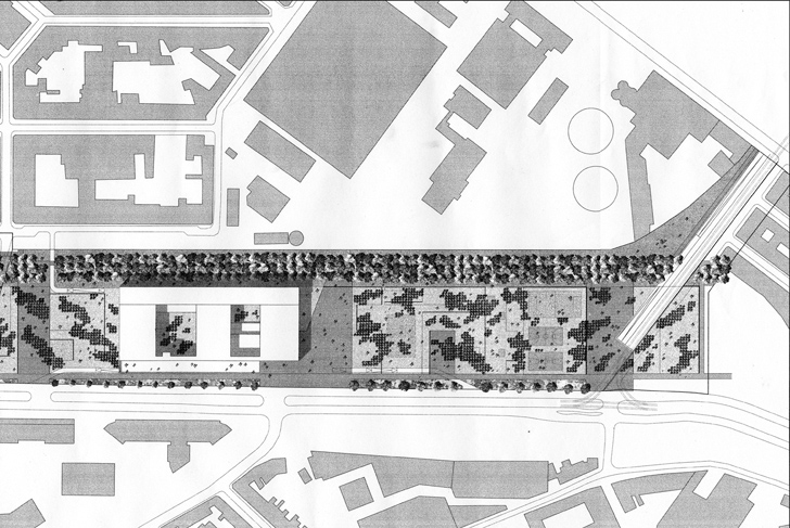 Se référant à l’architecture remarquable du nouvel édifice, le parc devient une sorte de composition abstraite. Une trame orthogonale rigoureuse accueille divers composants à la géométrie élémentaire: pelouses rectangulaires, talus, dalles et socles de béton, jardins décaissés, emmarchements apparaissent comme des éléments dont les combinaisons créent une multitude de lieux clairement définis. La grande qualité de mise en œuvre du béton et la maitrise de la topographie soulignent constamment ce jeu d’assemblage.