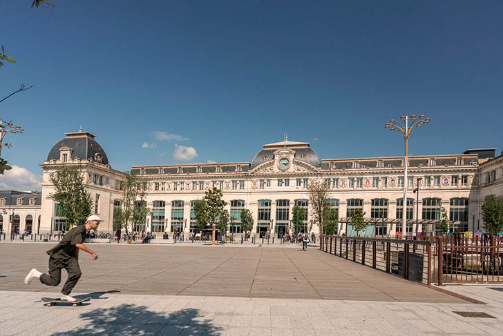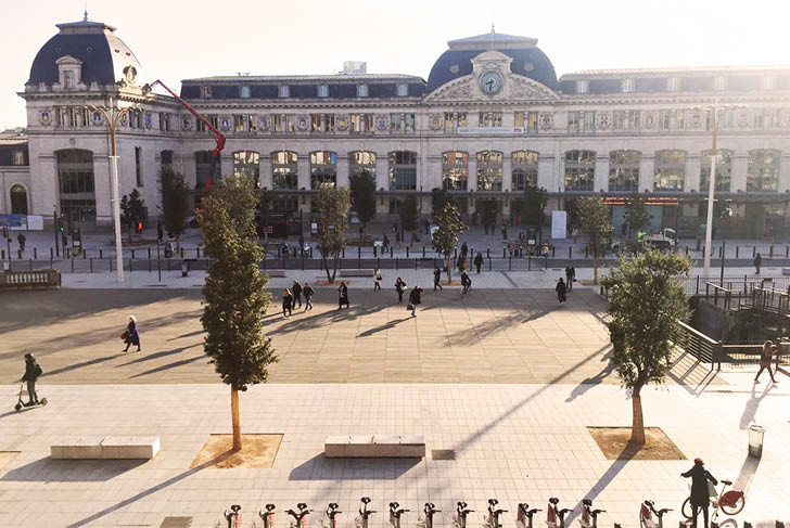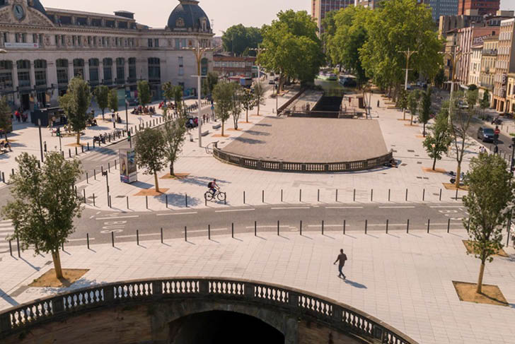 Située le long du Canal du Midi, classé au patrimoine mondial de l’UNESCO, et en bordure du centre historique, le nouveau parvis de la gare se transforme en une porte d’entrée attrayante de la Métropole. La structure végétale toulousaine est puissamment déterminée par quelques composants majeurs de la géographie et de l’histoire. Le fleuve, le canal, les anciens remparts ont modelé un paysage associant l’eau, les infrastructures et les arbres. De sorte qu’il existe une exceptionnelle connivence entre le végétal et les formes urbaines. Conçu pour accueillir d’importants flux piétonniers, le parvis se dote de nouvelles plantations et d’un mobilier urbain contemporain, accueillant, ajoutant à la lisibilité du site. La mise en lumière, faisant référence à la Croix d’Occitanie, affirme la modernité de ce nouvel aménagement, via ses 6 grands lampadaires spéciaux encadrant la place. L’emploi de matériaux nobles et locaux (granit du Tarn et chêne français) s'associe à une trame végétale renforcée, en complément de l’alignement du canal. Le long du canal, des espaces plus intimistes invitent piétons et cyclistes à redécouvrir l’eau, poumon vert-bleu de la Métropole.