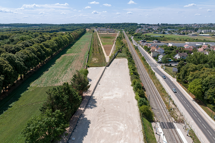 Le nouvel écoquartier de Gally prend place sur l’emprise de la caserne Pion, en limite ouest du Parc du château de Versailles. Après avoir réalisé une première étude sur site en 2015 pour la ville de Versailles, MDP se charge d’aménager les espaces publics de ce site de 20 ha avec un projet de paysage revisitant le modèle des Cités-jardin. Quatre séquences urbaines, paysagères et programmatiques se succèdent du sud au nord avec une gradation selon l’intensité des usages, allant de la plus forte concentration de personnes à une ambiance plus champêtre. La séquence d’entrée rassemble les principaux équipements (école, crèche) et commerces du quartier autour d’un espace public fédérateur, la place boisée. La séquence d’habitat collectif et individuel, dite des bosquets habités, est structurée par une promenade centrale et desservie par les venelles dessinant les différents îlots. Un Hôtel entouré par quatre parcelles de vergers constitue la troisième séquence, inspirée des bosquets des bains d’Apollon du Parc. Ce jardin nourricier amorce une transition vers une ambiance plus champêtre. La pointe Nord est grande prairie inondable et un lieu d’usages extensifs. Transversalement, à l’est, la grande terrasse, facilite la transition entre le Parc et le quartier ; à l’ouest, l’allée cavalière et son cordon boisé mettent à distance les voies du tramway.